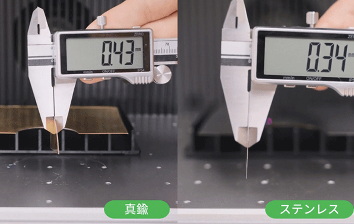 最大0.4mmの真鍮シート、0.3mmのステンレスシート、0.2mmのアルミニウムシートがカット可能です。